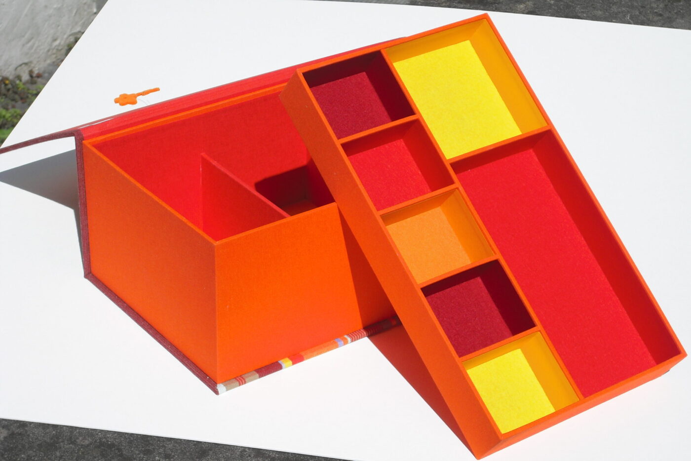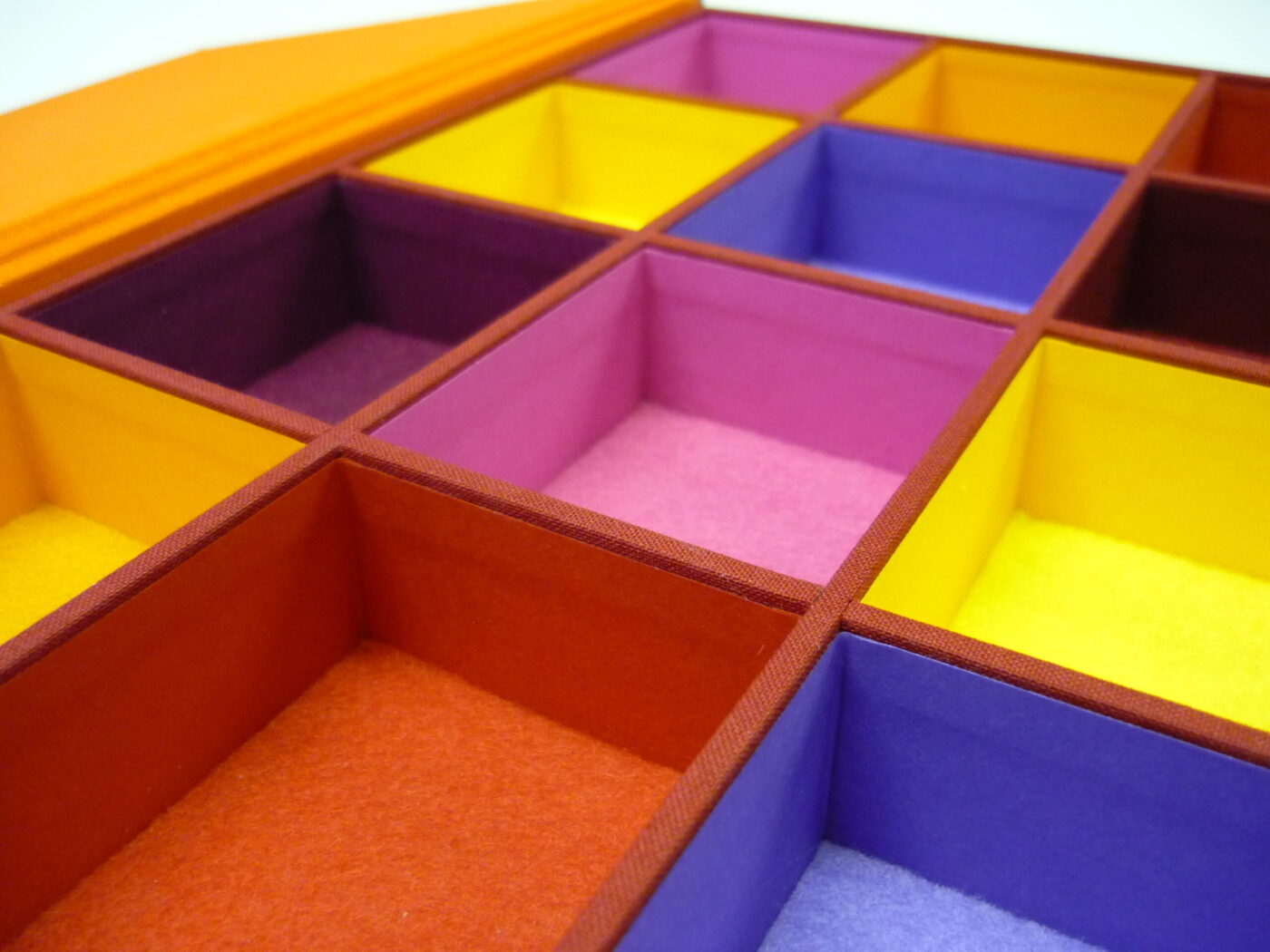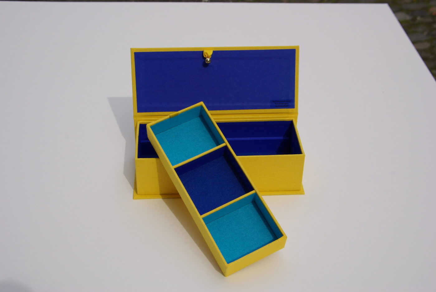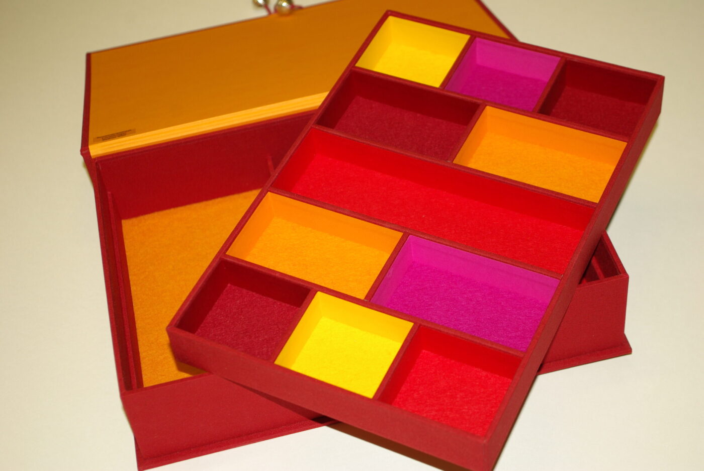 Mit viel Freude und Kreativität fertige ich auf Ihren Wunsch die passende Box für Ihre Lieblingsstücke in gewünschter Form, Farbe und Grösse an. Die Einteilung der Fächer ist frei wählbar. Gerne setze ich es so für Sie zusammen, damit Sie lange Freude daran haben.